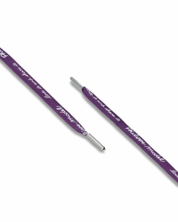 Lacet d’un côté en velours et satin avec logo sérigraphié de l’autre et aglet en métal nickel.