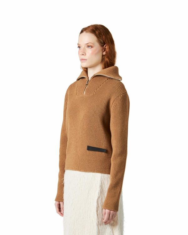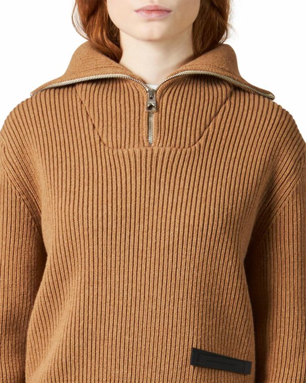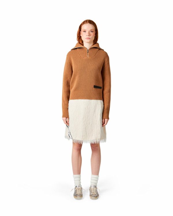 Affrontez l’hiver avec le nouveau pull demi-fermeture éclair beige en laine : assez sportif avec sa demi-fermeture éclair au niveau du col, il a une ligne douce sur le buste, avec une épaule tombante et une étiquette personnalisée sur le bas. Le maxi imprimé eau au dos ajoute une touche sportive, parfaite pour mélanger les styles.
