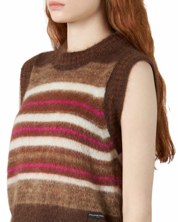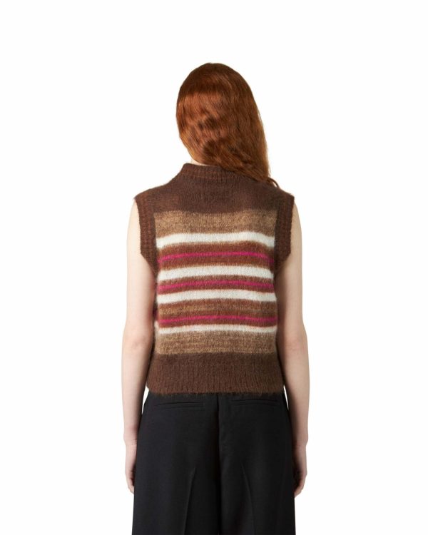 La douceur du mohair rend ce gilet marron à rayures vives particulièrement douillet. Court pour un look résolument contemporain, il est complété par des bords contrastés et une étiquette personnalisée au bas du vêtement. À superposer sur des chemises de la collection, ou sur un t-shirt pour une ambiance plus informelle.