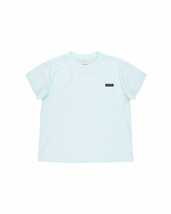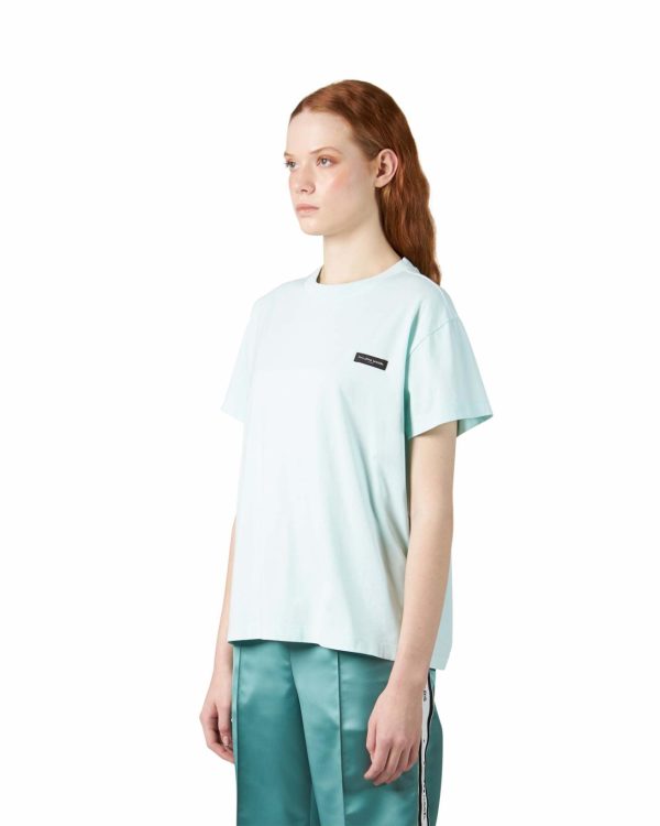 Essentiel et très tendance, le T-shirt bleu clair en jersey 100 % coton est teinté de nuances pastel pour compléter les looks féminins. Avec une coupe classique et une étiquette jacquard sur le buste.